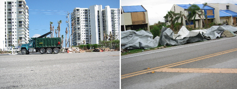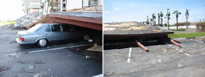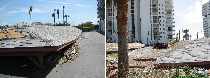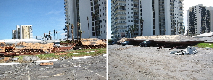 The remaining photos will give you an idea of just how devastating it was. The ocean was driven within a few feet of the buildings (see Figure 5). When the dust settled, the south building cooling tower was blown completely off the roof, and the boilers and roof were damaged. The concrete shingles on both garages were blown off and sent flying as missiles and half of the north garage roof was completely torn off. All the carports were flattened, along with the cars left under them. The Pergolas were reduced to a pile of splintered lumber and the pools had accumulated several feet of sand. Water was driven into the first floor apartments and common areas along with sand, dirt and debris. Some upper apartments that were not protected with shutters were destroyed as well as others that lost their shutters in the storms. Figure 8_9 shows the shoulder of SR A1A piled six to eight feet high with the debris, and it hurt to see pickers along the road taking what was once a part of our condo. And more, so much more.