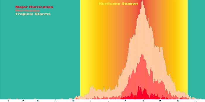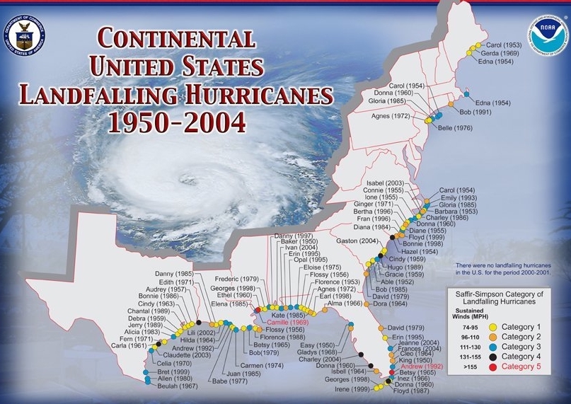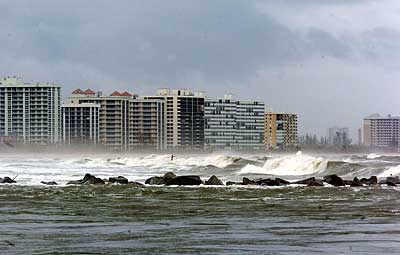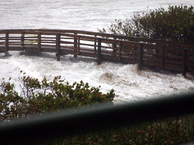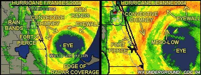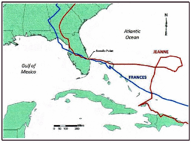 Figure 1 shows the landfall points of past hurricanes on the shores of the U.S. east coast. Figure 2 shows the hurricane probability curve through the seasonal months. Figure 3 shows the storm track for both Frances and Jeanne superimposed. Notice the only place the two tracks coincide is the landfall point on Hutchinson Island. Figure 4 shows the unbelievable similarity of the comparative size and location of both hurricanes on the radar screen as they approached the Fort Pierce area. The rage of the ocean is apparent in the Figure 5 photo of the extent of the ocean's reach at the Tiara dunewalk during the storm's approach.